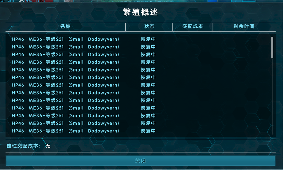 ### 繁殖器使用方法视频介绍  ### 繁殖器使用方法文字介绍 本服推荐使用了S+Mod中的繁殖器,105级印痕,制作材料比较贵,推荐金币商店200金币购买。新手礼包里有3个。  使用繁殖器对印痕是否解锁没要求,需要使用能量元素启动,每个能量元素能维持繁殖器运行10分钟。胎生生物可以使用繁殖器,并且产出的是蛋,这点相当舒服。**服务器设置:S+繁殖器不能改变性别,不能使原本不能繁殖的生物繁殖**(甚至鸭嘴飞鼠都不行)。 繁殖器有100个格子,当满足下面全部条件才可以繁殖。 | 序 号 | 条 件 | | --- | --- | | 1 | 繁殖器已经启动 | | 2 | 全是同一种龙 | | 3 | 至少有一只母龙 | | 4 | 有且只有一只公龙 | | 5 | 至少保留一个空的格子 | 其中第5点是经常出问题的,详细解释下。  我“pg”(屁股)文件夹内放了98只母龙,现在又放了一个公龙和一组能量元素,现在点开始繁殖,查看繁殖进度如下。  这时看到母龙的状态都是恢复中,然而没有写剩余时间,这就是因为繁殖器满了,无法继续工作。当结束繁殖后,拿掉这组能量元素并重新点开始繁殖,这时就可以开始交配了。**所以繁殖器最多可以放98只母龙,需要留两个位置放公龙和能量元素**。 上图的“开始繁殖”下面有个“保持不变”,很不建议去更改,点一下会变成“扔出蛋”。这个本来是用来将繁殖内生产出的蛋扔出来,防止繁殖器满了停止工作,但扔出来的蛋,可能会因温度不够而死亡,如果顺利孵化,也有可能因未能及时领养而消失(5分钟内未领养会消失)。还有就是,它扔的很远,位置很随机,捡蛋巨麻烦。。 一般情况,不需要让繁殖器一直开着,用能量元素启动之后就可以把能量元素拿出来,一直开着消耗会很高,而且产蛋效率不会高太多,还不如每12小时启动一次划算。 注:S+繁殖器产出的蛋为S+蛋,与正常繁殖的蛋存在些许区别,就比如。。。**没法作饲料**。