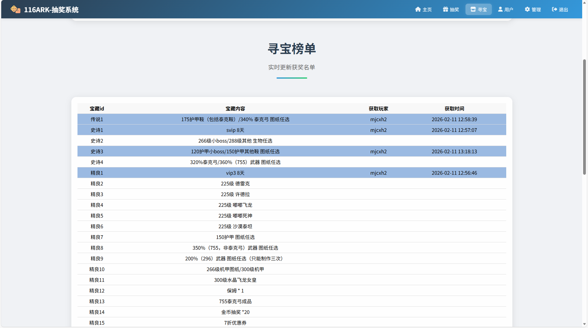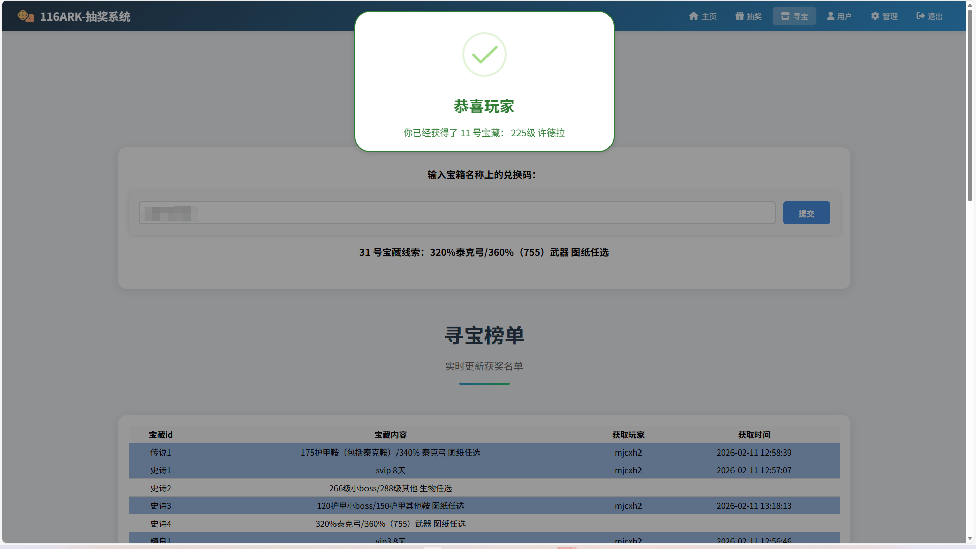 ## 活动简介 寻找散布在地图中藏有宝藏的箱子。 本次 春节 活动使用的地图为 **==孤岛==**,版本号:**361.7**,于 **==2月13日(农历腊月二六)晚上8点==** 开始,持续开启 **==5==** 天(可根据活动情况进行调整),或者宝物被全部找到后结束。宝物将在活动结束后统一发放。。 服务器倍率:3倍采集,5倍驯养,10倍成长。==找到宝藏第一时间去 [抽奖的寻宝页面](https://cj.116ark?page=activity_treasure.com) 兑换奖品和信息,并清晰截图(**能看清兑换码,否则出现纠纷,不能作为有效证据**)私聊发送给qq群管理员 “寻宝助手”,如果出现纠纷,将以 **发送截图的时间** 为最先评判标准,如果出现兑换码不存在的情况,第一时间截图并私聊。死亡、崩服等任何造成的丢包损失不予赔偿==。  ## 活动规则 寻宝使用的服务器 **不与主服务器互通**,**不使用任何mod**,玩家需要在活动服务器 **新建角色** 并重新驯服恐龙去寻找宝藏。 宝箱分为4个品质,分别为传说、史诗、精良、普通。其中只有 普通 品质的宝物会在这个文档中给予一些信息提示。其他品质宝物的提示信息,只会出现在次一等品质的宝箱上,玩家需要将 **==宝箱上的兑换码(宝箱名称)保存下来,登录 [抽奖的寻宝页面](https://cj.116ark?page=activity_treasure.com)==** 兑换信息,系统将记录第一个兑换的人作为宝藏获取者,并在寻宝页面公示。  宝箱信息具体如下 | 宝箱品质 | 宝箱数量 | 宝箱信息 | | --- | --- | --- | | 传说 | 1 | | | 史诗 | 4 | 传说品质物品的 **一个** 提示信息 | | 精良 | 16 | 某个史诗品质物品的 **一个** 提示信息 | | 普通 | 32 | 某个精良品质物品的 **两个** 提示信息 | 宝箱内的提示信息分为4种,分别是 **==宝箱截图==、==宝藏名称==、==宝藏所在区域名称==(游戏内按h,左上角会显示)、==宝藏所在大致位置截图==**。 普通宝箱的大部分提示信息会在活动开始前公布,所在大致位置截图 会在活动第二日晚八点公布。 ==普通品质宝物每人最多可兑换4个。超过4个将只获得提示信息,但不作为宝箱获取者。== 寻宝活动结束后,只允许与其他人**交换**一次**同品质**宝物。 宝箱只会出现在允许建造的地方,放在有 有效地域名称的位置(深海、荒野等为无效地域名)。宝箱不会放置在建筑物上,也不会放在平台鞍上。 ## 宝藏物品 | 品质 | 宝藏 | | --- | --- | | 传说 | 175护甲鞍(包括泰克鞍)/340% 泰克弓 图纸任选 | | 史诗 | svip 8天 | | | 266级小boss/288级其他 生物任选 | | | 120护甲小boss/150护甲其他鞍 图纸任选 | | | 320%泰克弓/360%(755)武器 图纸任选 | | 精良 | vip3 8天 | | | 225级 德雷克 | | | 225级 许德拉 | | | 225级 嘟嘟飞龙 | | | 225级 嘟嘟死神 | | | 225级 沙漠泰坦 | | | 150护甲 图纸任选 | | | 350%(755,非泰克弓)武器 图纸任选 | | | 200%(296)武器 图纸任选(只能制作三次) | | | 266级机甲图纸/300级机甲 | | | 300级水晶飞龙女皇 | | | 保姆 * 1 | | | 755泰克弓成品 | | | 金币抽奖 *20 | | | 7折优惠券 | | | 升级卡 * 2 | | 普通 | vip1 8天 | | | 金币 888 | | | 金币 1888 | | | 金币 2888 | | | 点券 666 | | | 点券 888 | | | 点券 1314 | | | 变异卡 * 3 | | | 恐龙改色卡 * 3 | | | 角色改名卡 *3 | | | 恐龙传送卡 *3 | | | 全部恐龙喂养卡 *3 | | | 三级战利品箱 *5 | | | 诱变剂 *100 | | | 金币抽奖次数 * 10 | | | 满伤害武器(除泰克弓)成品任选 | | | 满伤害武器(除泰克弓)成品任选 | | | 225级 原版龙任选 | | | 225级 原版龙任选 | | | 9折优惠券 | | | 9折优惠券 | | | 8折优惠券 | | | 8折优惠券 | | | 7折优惠券 | | | 升级卡 | | | 升级卡 | | | 升级卡 | | | 升级卡 | | | 升级卡 | | | 升级卡 | | | 升级卡 | | | 升级卡 | 注:“/”是 或 注:升级卡可以升级**自己或者主服务器部落成员寻找到**的其他奖品,可以升级一项宝藏5%的属性,仅可以对恐龙等级、图纸数值、vip天数、金币点券进行升级,可以叠加使用(先用加法算加了多少属性,再去算乘法),具体值四舍五入,vip一张卡提升一天。以两张卡,一共加10%为例:龙的话等级直接*1.1,图纸是(宝物加成-原始加成)*1.1+原始加成,就比如宝藏是300%的泰克弓图,(300%-100%)*1.1+100%=320%。如果无法使用将作废。 注:海洋更新后,发放恐龙性别可能无法随机。